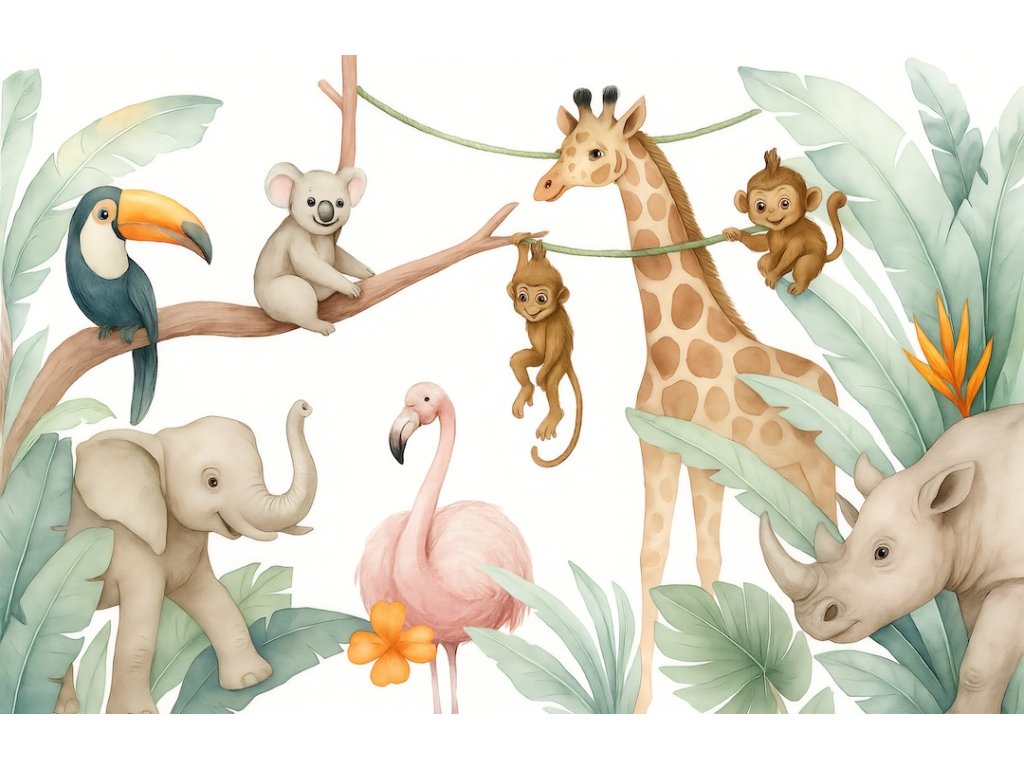 Proměňte pokoj svých dětí v tropický ráj plný dobrodružství a zvířecích kamarádů! Tato originální fototapeta s motivem džungle přináší veselou partu zvířátek – žirafu, sloníka, opičky, tuka, koalu, plameňáka i nosorožce – doplněnou exotickými rostlinami a jemnými barvami, které působí hravě, ale nevtíravě.
