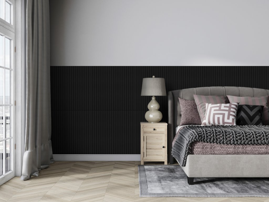 3D samolepicí stěnový panel za postel černé mini pruhy samet
